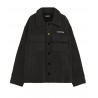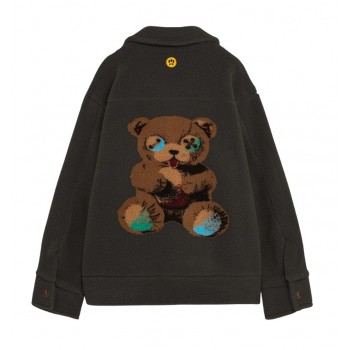 chiusura frontale con bottoni. Tasche con pattina e logo ricamato sul petto. Sul retro, grafica orsetto stampata. Dettaglio finale: patch smile applicata sul retrocollo.